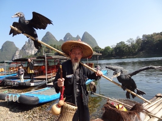 Vi stoppet ved en gammel mann med fugler på en stang. De tamme fuglene var skarver som blir brukt til å fiske med, og som det er lange tradisjoner for her. Denne gamle mannen ville ikke fiske, men bli tatt bilder av sammen med oss. Det fikk han ti yuan for, mer lønnsomt enn å fiske. Trist hva vi turister gjør med gamle tradisjoner – gjør de om til en oppvisning. Vi fortsatte videre oppover elva omkranset av sukkertoppfjellene, og gikk i land etter to timer ved en liten landsby. Vi trødde litt rundt, møtte to unge kinesiske jenter som viste oss litt av landsbyen, og fikk se bambusskog på nært hold, samt mange flotte sommerfugler i forskjellige farger. Glad for at Stephanie var med oss, og kunne oversette. Etter en stund fant vi faren til Sam som hadde kommet for å kjøre oss tilbake til Yangshuo. Det ble ingen tur i grotte, Kaisa var ikke i form til det.