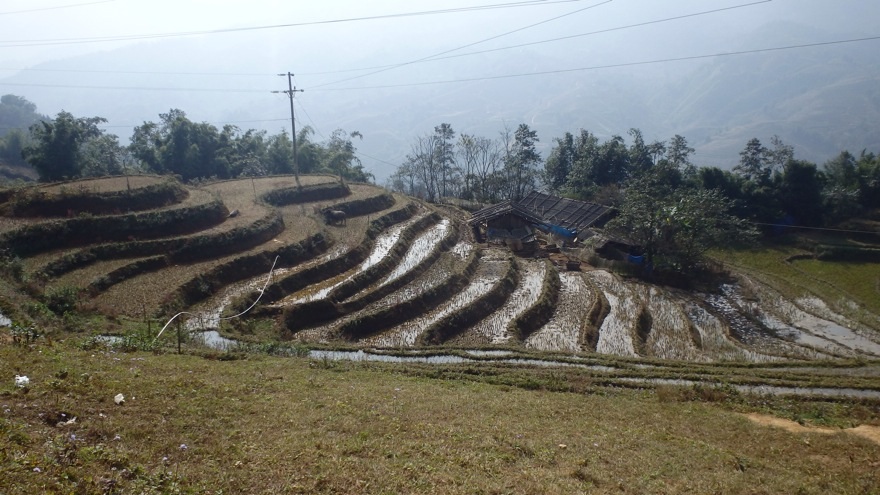 Da vi ankom Lao Cai i morges, så det ikke lovende ut, men på kjøreturen opp i fjellene forsvant tåken gradvis, og avslørte fjelltopp på fjelltopp. Nedover fjellsidene var det anlagt terrasse på terrasse med ris. Det vil si, risen ble høstet inn i september, og risterrassene står brakk om vinteren. Vakkert var det lell. Enda vakrere er det om sommeren når terrassene er lysegrønne, for ikke å snakke om høsten, når risen er moden og gyldengul.