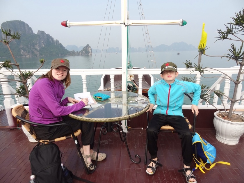 Da vi kom ut fra øya, og til den flytende landsbyen, tittet sola frem, og resten av dagen var vi velsignet med sol som skinte gjennom disen. Vi har i det hele tatt hatt mye bra vær så langt, to dager med regn i Yangshuo, og et par dager overskyet, og resten har vært solskinnsdager. Da skal man ikke klage! Resten av turen tilbrakte vi på dekk på båten vår, Kaisa tegnet, mens Isak spratt litt rundt slik han pleier. Vi gjorde lekser, og spilte kort, og hadde enda et fantastisk måltid med utallige småretter, før det var dags å gå planken for å komme seg i land igjen. Turen vår i Halongbukta var over.