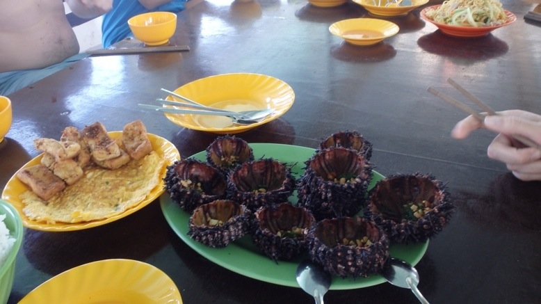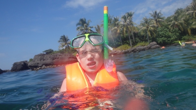 Turen gikk videre til sørøya, hvor vi gikk ombord i en badebåt, som underveis utover til småøyene enda lenger sør, stoppet ved et hus på flåte, hvor de kjøpte inn alskens sjømat til lunsjen. Så var det fiskestopp, og så kom vi fram til stedet hvor vi skulle ut å snorkle. Alle som kjenner meg vet at jeg er mer komfortabel på fjellet enn nær vann, og det å hive seg ut på dypt vann fra en badebåt er den store skrekken for meg. Isak og Kaisa er som fisken i vannet, begge snorkler, dykker, og svømmer, og de er nær sagt mer under enn over vann. Jeg er mer som en havhest, svømmer sakte, sakte, med hodet høyt hevet. Hater å få vann i øynene, og har enda svømminga på skolen i friskt minne, som jeg alltid gruet meg til. Så altså ikke det beste utgangspunktet for snorkling. Nå savnet jeg virkelig Geir Tore, han som alltid er ute å svømmer og leker med ungene, mens jeg får ligge under en parasoll og lese bok. Som alenemamma på tur går ikke det. Jeg hadde i grunnen tenkt at Isak og Kaisa skulle få gjøre dette uten meg, men nei! Det var flere båter som la seg til her, relativt store båter, og så var det frislipp av svømmende turister som skulle inn mot land for å snorklet og se fisk. Det var et stykke å svømme, og det syns jeg ikke de kunne gjøre alene. Heldigvis fikk vi tilbud om redningsvester, noe de fleste slo til på, og også vi. Reddet av gonggongen spør du meg, bedre rustet til en lang svømmetur. Så uti bar det, og vi svømte oss forbi tre båter, og nærmet oss land med koraller og fisk. Isak og Kaisa var helt i hundre, syns det her var alle tiders, og jeg syns heller ikke det var så værst, faktisk ganske gøy etterhvert, selv om jeg ikke snorklet, – et sted går grensen! Men i et svakt øyeblikk har jeg nå lovt Isak at jeg skal prøve å snorkle i løpet av denne turen. Tenker jeg utsetter det til vi kommer til Thailand…