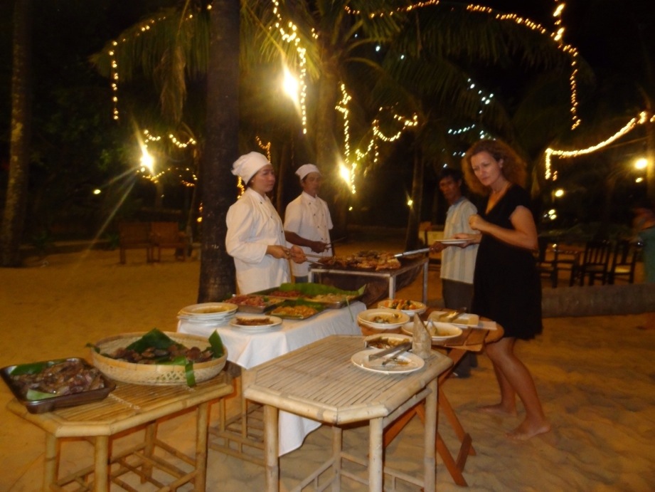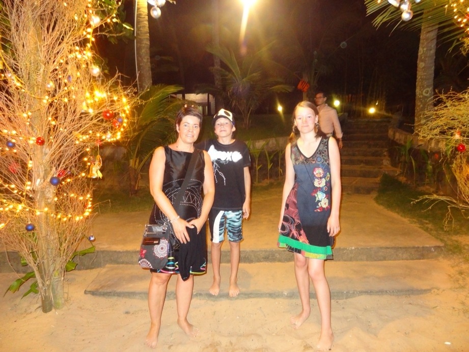 Vi fikk overekt en rød invitasjon til kveldens gallamiddag. Kl 18.40 skulle det hele begynne, og vi var da klare. Ho mor i sin nye Chula-kjole, Kaisa i lånt kjole, og Isak i nyvasket shorts og t-skjorte. Vi var med andre ord pyntet til trengsel! Det ble velkomstdrikk, og det var en stor buffet med alskens godsaker, virkelig godsaker, så synd å si, men ribba var ikke savnet. Vi forsynte oss flere ganger med ulike salater, sjømat, baconstekte grønnsaker, suppe, og all mulig grillet sjømat og ulike typer kjøtt. Noe for enhver med andre ord, for ikke å snakke om Kaisa som hadde lesset på fatet, så det ble en topp oppå. Har ikke sett henne noen gang forsyne seg så godt. Han andre karen var det værre med, men han fant seg grillet kylling og stekt ris med grønnsaker som gikk ned. Til dessert var det et helt kakebord men mange sorter. Vi spiste så øynene begynte å rulle, akkurat sånn det skal være på julaften…
