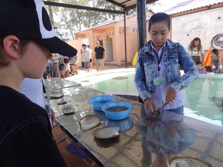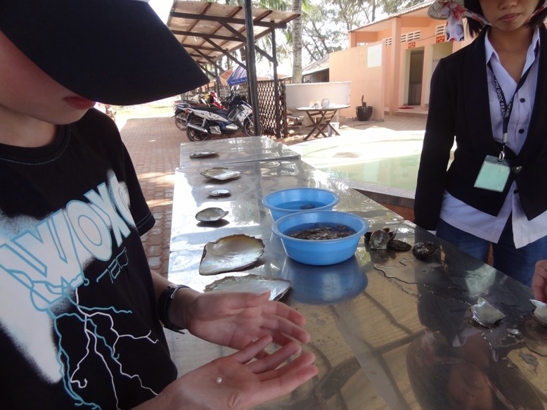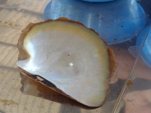 Vi hadde ikke tenkt å kjøpe noen perler, og var nesten litt motvillige da vi for noen dager siden skulle på båttur, og minibussen stoppet på vei ut til fergeleiet ved en perlefarm. Men vi måtte jo inn å se. Vi fikk demonstrert hvordan de åpnet en musling for å se om det var en perle inni, bare ca. 60% av muslingene inneholder perle. Og det er alltid en overraskelse hvordan perlen ser ut, perfekt rund, eller mer ujevn, og så ikke minst hvilken farge perlene har. For de kommer i mange slags farger, hvite, grå, lilla, svarte, og noen av de mest verdifulle som er brune.