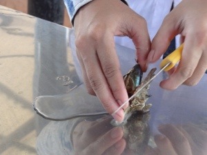 Isak fikk være med på å åpne en musling, og inni var det en liten hvit perle. Perlene får farge etter hvilken farge det er på perlemoren inni skallet på muslingen. Det er ingenting på yttersiden som sier noe om hvilken farge perlen inni vil ha. Isak fikk den lille hvite perlen, og østersen som perlen lå inni. Stor stas!