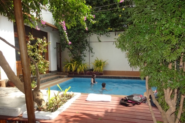 Vi har kommet til det mest fantastiske gjestehus!!! Et gjestehus hvor overskuddet går til å drive skole og barnehage for vanskeligstilte familier. Gjestehuset ligger litt tilbaketrukket i en rolig gate, men sentralt, og er lokalisert sammen med skolen og barnehagen. I første etasje er det også kunstgalleri med flotte malerier malt av You Kihn, og ulike musikkinstrumenter er også stilt ut. Her er basseng, liten koselig kafe, og et fellesrom i andre etasje med bibliotek, tv, og billjard. En oase for ungene og meg. Her kan vi trekke oss tilbake når bylivet og alle dens inntrykk trengs å fordøyes.