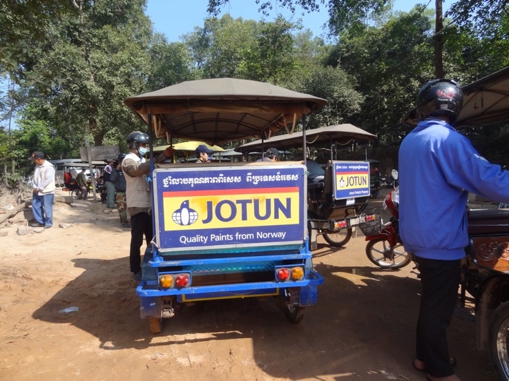 Tro det eller ei, men Norge er kjent for mange i Kambodsja. Og hva er vi kjent for tro? Ikke olje, ikke fisk, ikke Telenor, ikke Nobels fredspris, men Jotun maling!!! Overalt så vi reklameskilt for Jotun maling. Ikke små pingleskilt som vi ser hjemme, Nei, store skilt på stativer høye som hus. Og som reklame bak på mange tuktuker som kjørte omkring både i Phnom Penh og Siem Reap. Hadde ikke trodd vi skulle bli glad for å se reklame for norsk maling, men det ble vi!