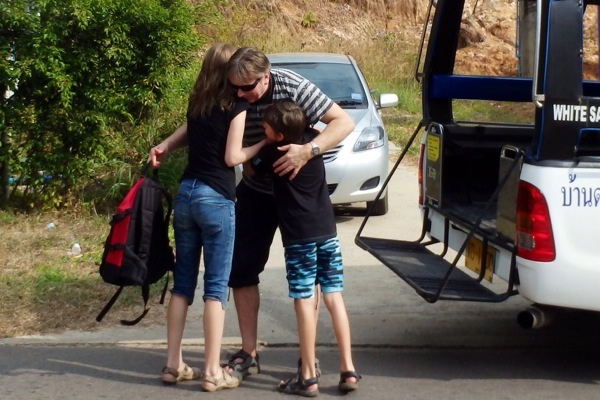 Sånn skulle det ikke gå. På grunn av snøstorm i USA ble flyet åtte timer forsinket ut fra Gardermoen. Og da Geir Tore ankom Bangkok, var det fullt på neste fly videretil Trat. Han hev seg til i en drosje, i håp om å nå siste ferge til Koh Chang, men hans sjåfør var nok ikke helt samme kaliber som våres, ellers ville de rekt ferga med god margin. Så det ble overnatting i trat, bare noen mil unna oss, dere skal tro geipen hang her. Opprinnelig skulle også min mor- Isak og Kaisas Áhkku komme, men siden hun nylig ble bestemor til verdens skjønneste lille Sofie så ble turen hennes kansellert. Noe vi var kjempelei oss for!!! Og Så skulle det ta en dag til før Geir Tore kom hit. Han var klar på første ferge over klokka syv neste morgen, og vi sto på veien utenfor Tranquility bay Resort og ventet på han. Gjett om vi var glade da han kom. Det ble mange klemmer, og etterhvert mye som skulle fortelles….