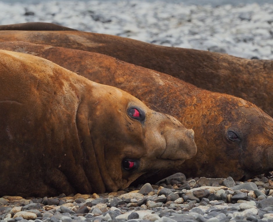 Elefantselene som lå på Jenny Island var få, og en mindre sel som lå for seg sjøl, var bare en selunge, født i november, kunne biolog Manuel Marin fortelle. De andre var unger fra i fjor. Disse lå i en klynge, og tok kanskje en formiddagslur? De lå med øynene igjen, og rørte litt på seg innimellom, klødde seg med luffene, og så plutselig åpnet den ene selen øynene sine og så meg rett i øynene med blodskutte øyne. Jeg tok feil, ingen formiddagslur, men soving etter en formidabel fest! Makan til blodskutte øyne har jeg aldri sett før.