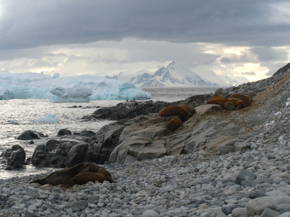 Da vi nærmer oss land ser vi og lukter de store skapningene som har tatt seg møysommelig opp på stranda her ,- elefantsel. Jippi, tenk å få se den største selarten! Hadde ikke forventet det! Hannselen kan veie inntil to tonn. Når de store hannene står med luffene på bakken og hever hodet, måler de to meter i høyden, ingen småkar med andre ord. Stranda på Jenny Island består av rullesteiner, og selene ligger 20-30 meter inne på land. Det må litt krefter til for å forflytte så store masser, og det må være tungt for dyrene.