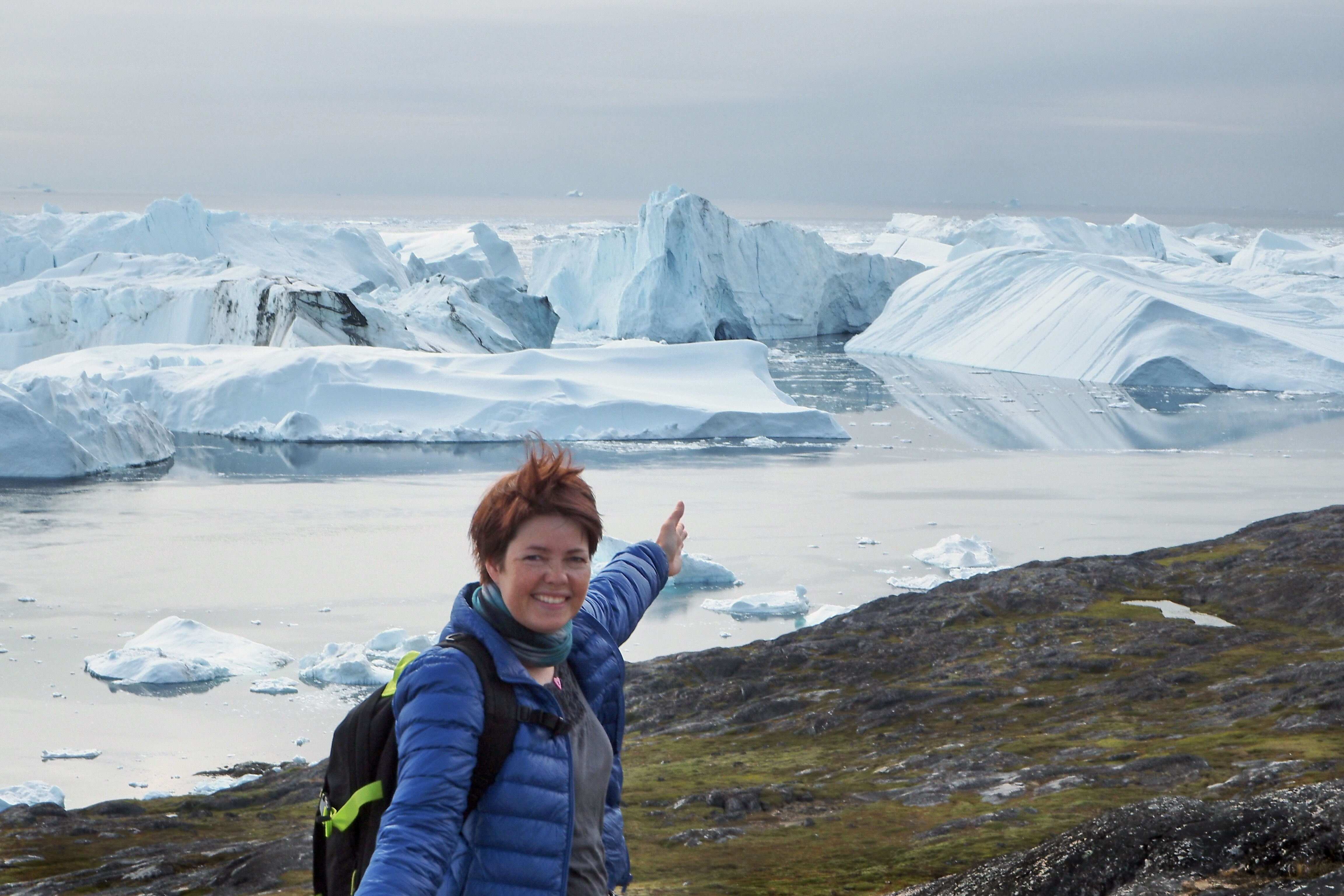 Turen bar videre mot Ilulissatfjorden, hvor vi kunne skimte enorme isfjell. Ilulissat betyr isfjell, og fjorden står på UNESCOs verdensarvliste. Isbreen som kalver i denne fjorden er en av de mest aktive breene på Grønland, og under smeltinga om sommeren er det mye aktivitet i breen, faktisk så mye at de høye isfjellene på inntil 100 meter endrer landskapet fra dag til dag. Nye isfjell kom hele tida til, og skuffet unna gårsdagens isfjell. Fascinerende, men også en påminnelse om oppvarming og klimaendringer. Isbreforskere har beregnet at om all isen på land på Grønland smelter vil havet stige med 7 meter. Dette skjer selvfølgelig ikke over natta, men breene på Grønland er i bevegelse, og nye isfjell som hver dag seilet forbi oss var en påminnelse om dette.